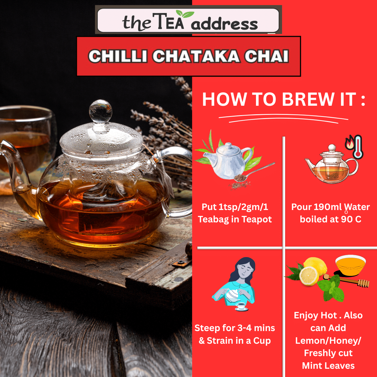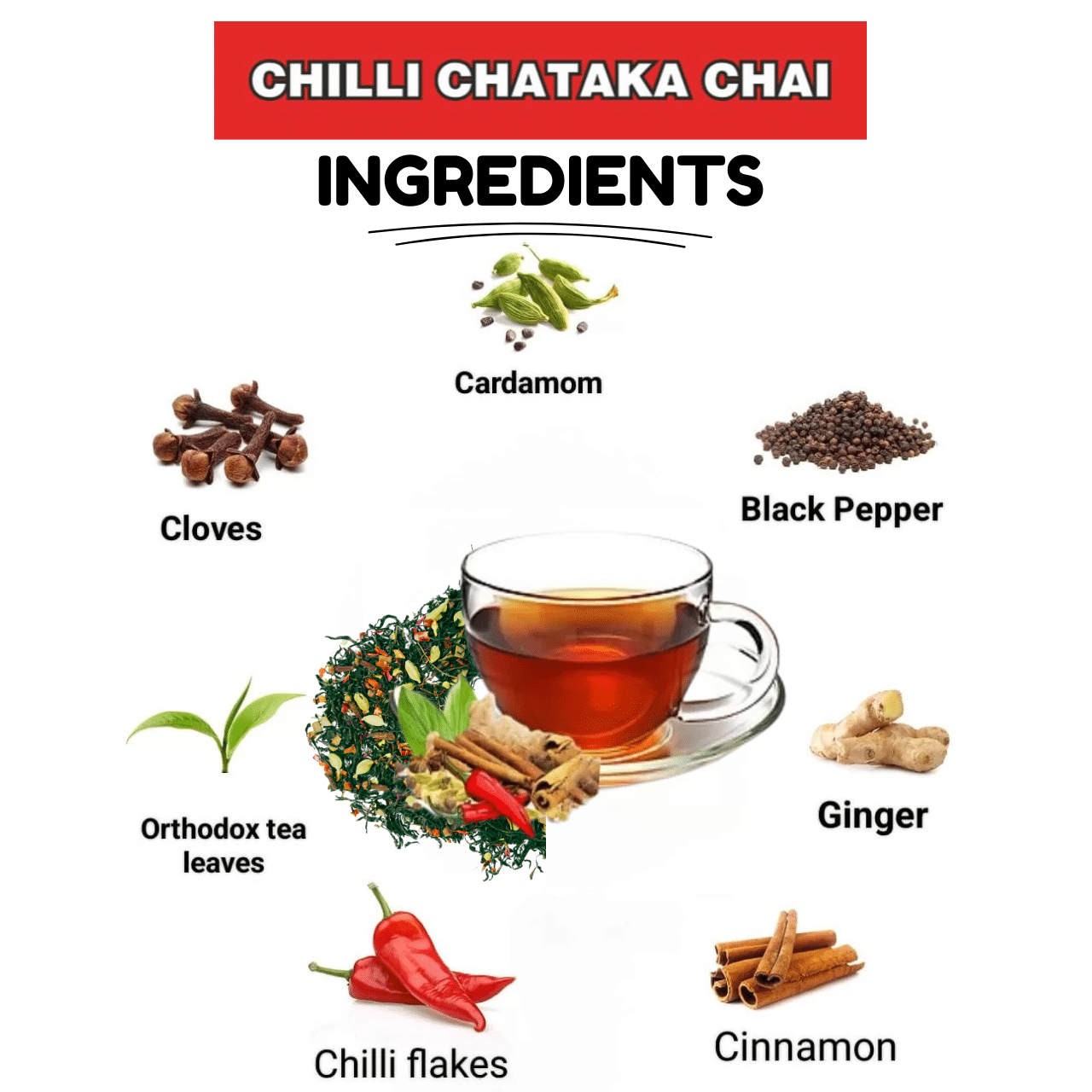 Orthodox black tea, Chili flakes, Ginger, Cinnamon, Cardamom, and Cloves.