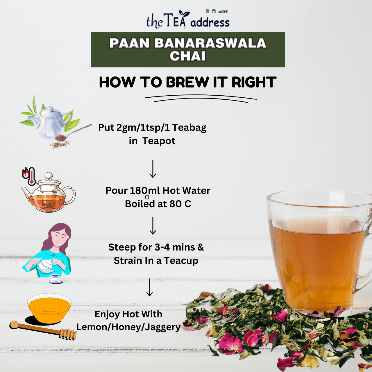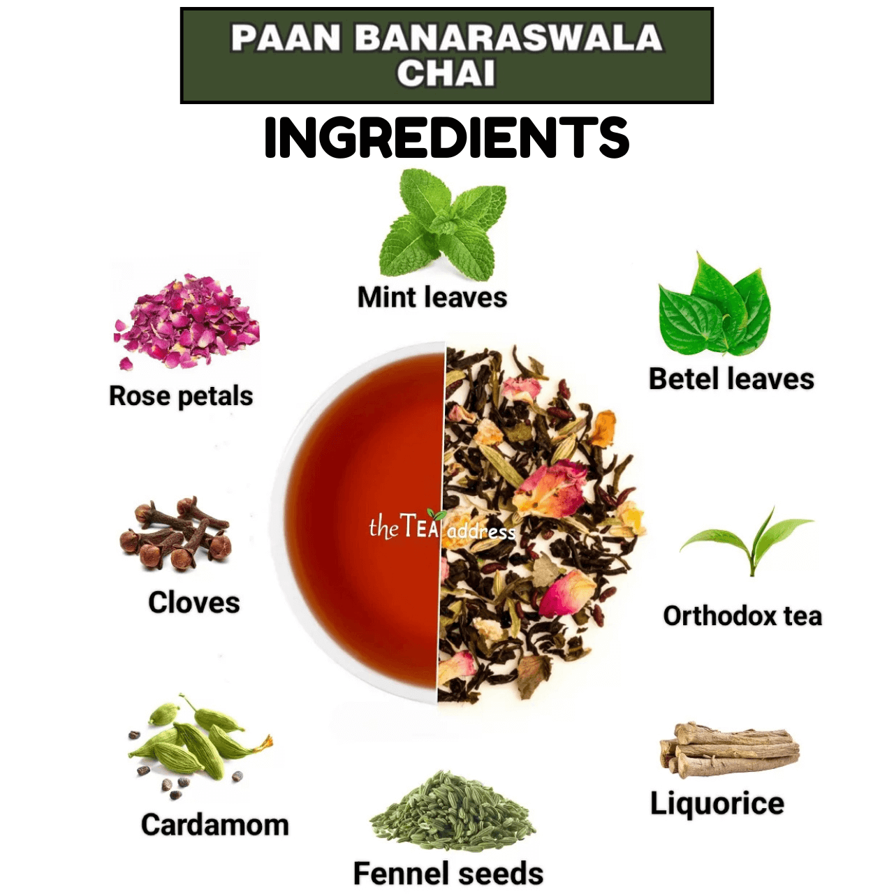 Black tea leaves, Paan leaves( betelnut leaves), Fennel seeds, Rose petals, Licorice roots, Cardamom, Cloves and mint leaves.
