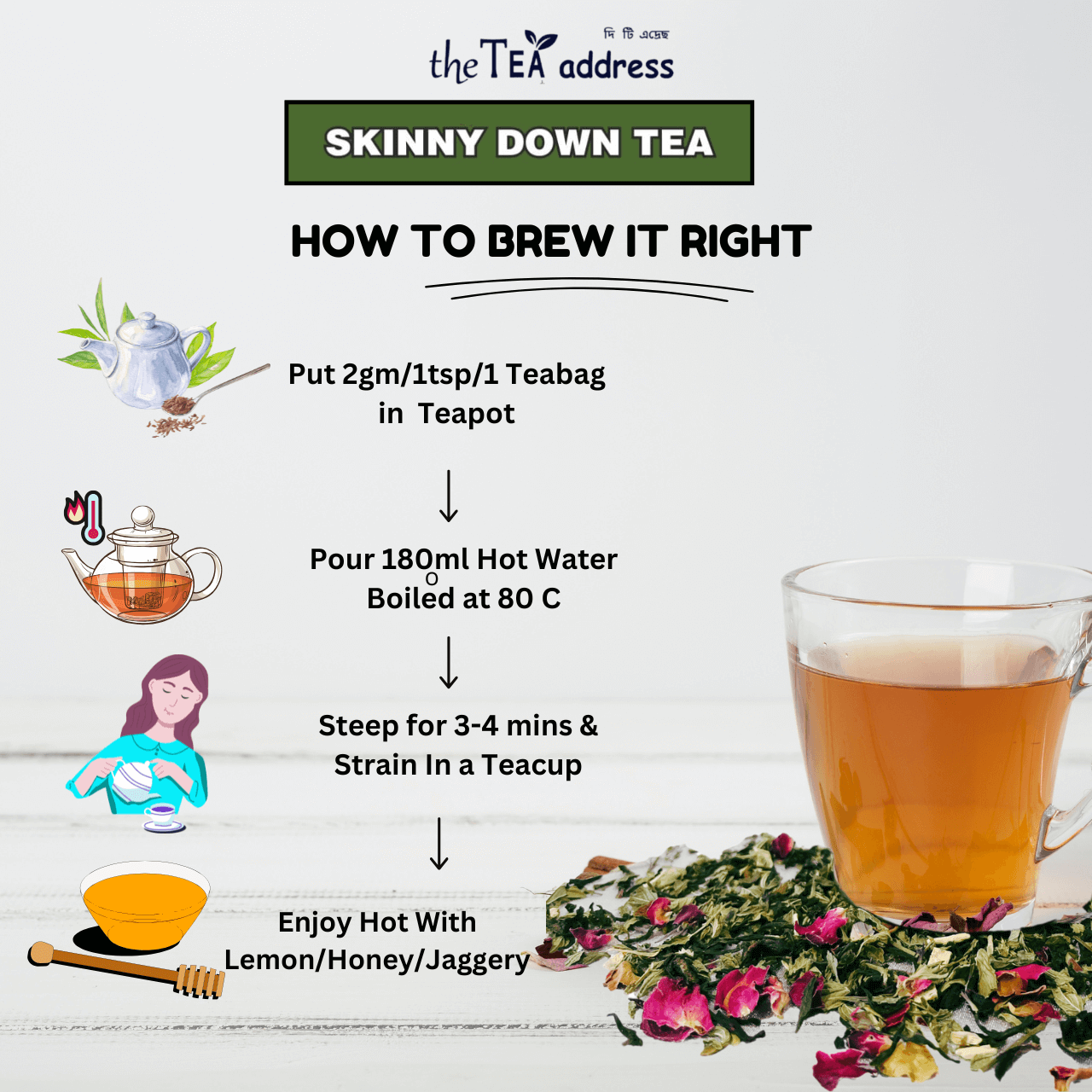 We recommend drinking this tea plain hot and suggest you switch over from regular milk tea to “SKINNY DOWN TEA “ and ensure healthy and fit you !!