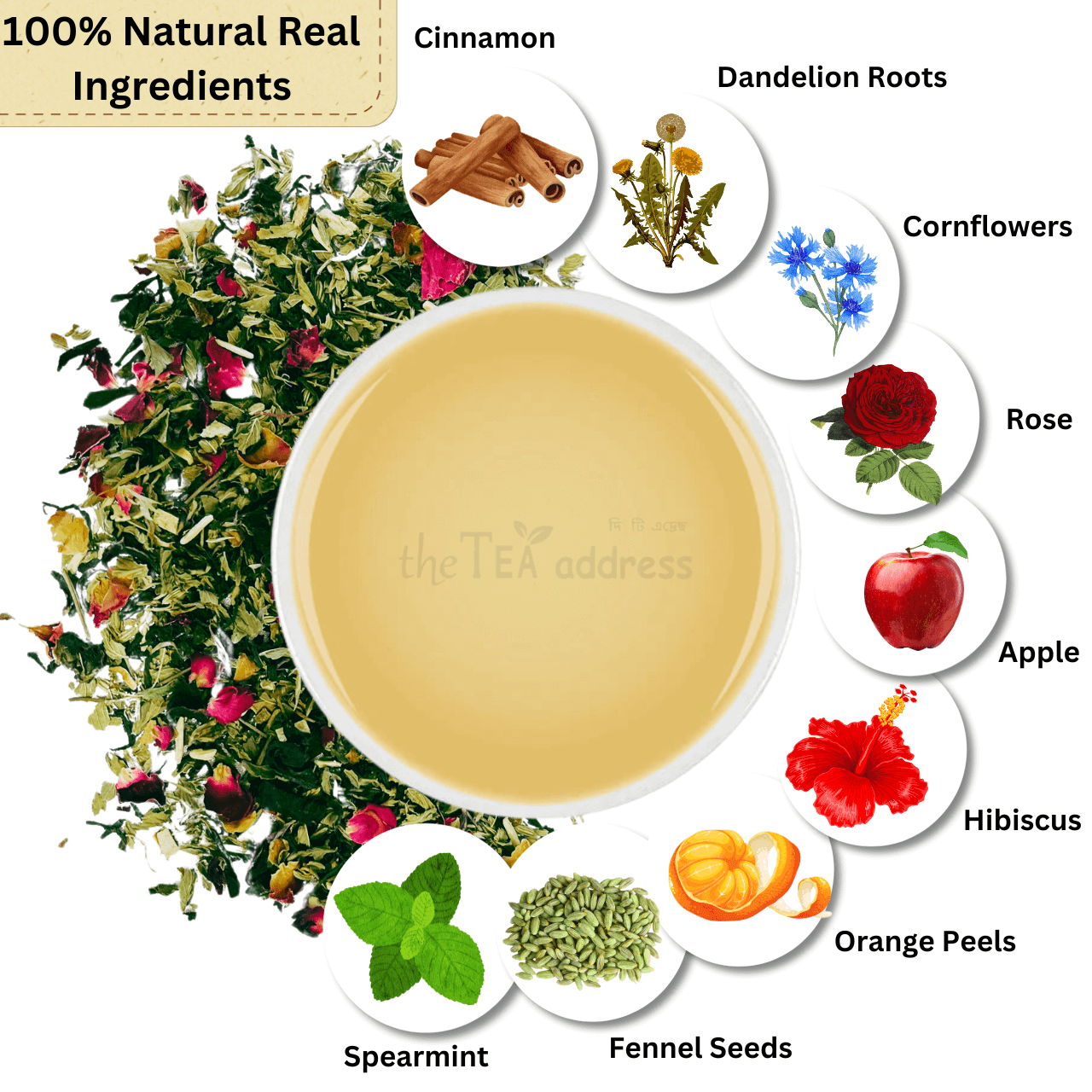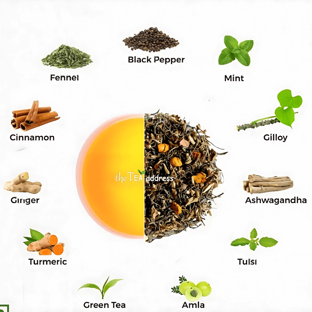 Green Tea Leaves, Rama Tulsi, Shyama Tulsi, Vana Tulsi, Cinnamon, Spearmint Leaves, Rose Petals, Lemongrass, Orange Peel, Arjun chhal